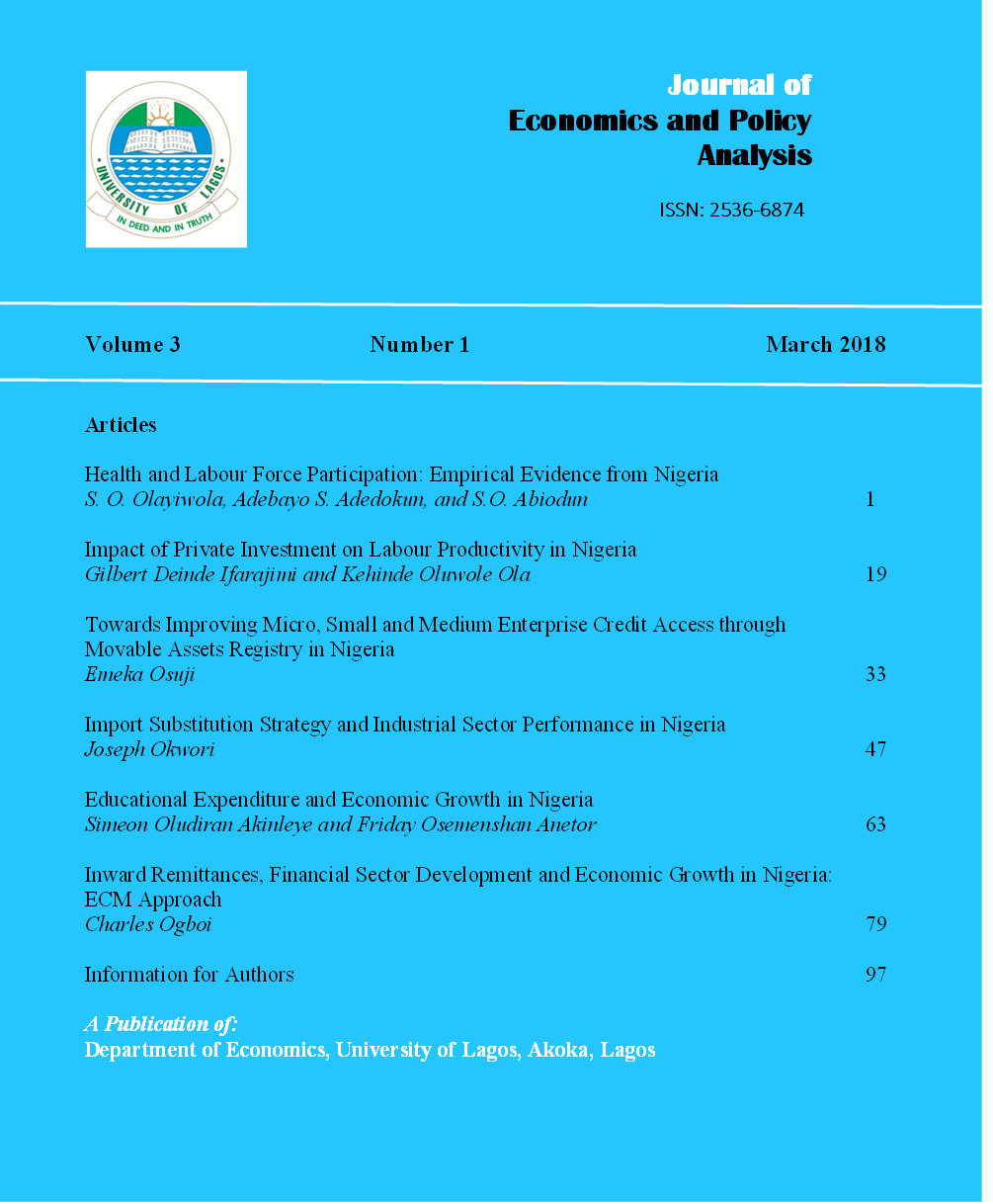 Vol 2 No 2 (2017)This issue addresses financial inclusion, governance and welfare analysis in Nigeria; gender and socioeconomic determinants of ownership; oil price shock and macroeconomic variables; Human capital development and sustainable development in Nigeria; worker remittance and inclusive growth; trade, capital flow and economic growth in Nigeria.